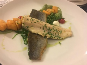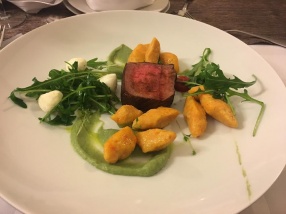 A főétel érlelt marharostélyos egészben, vagy pisztráng egészben sütve, karottás gnocchival, karfiolkrémmel és mozzarellás salátavariációval.