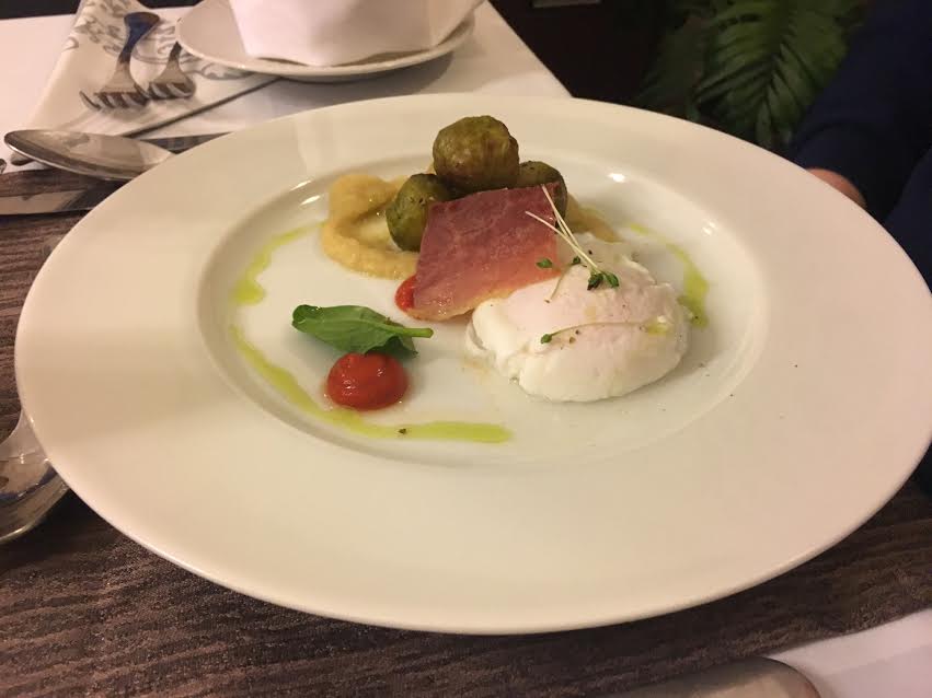 Üdvözlésként gyömbéres zelleres almaturmix-szal indítottak. Az előétel ezt követően buggyantott tojás, sült kelbimbóval és fokhagymás paszternák krémmel, szárított házisonkával.