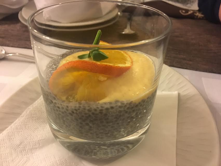 Desszert vaníliás chiapuding, fahéjjas narancshabbal.