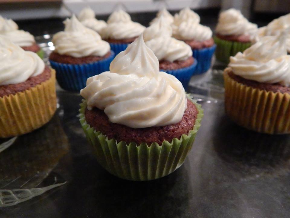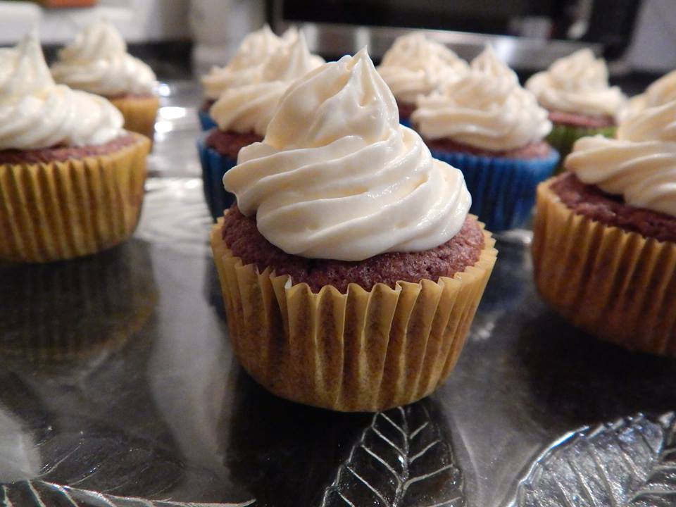 A kész kis muffinokat minimum langyosra hűlni hagyjuk, majd a tetejükre a mascarponés krémből habnyomó segítségével habrózsákat készítünk. Díszíthetjük még cukormentes csokoládé-pasztillával is.
