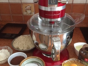 A száraz hozzávalókat egy tálban összekeverjük: (kakaó, dió, kókuszreszelék,só,szódabikarbóna)