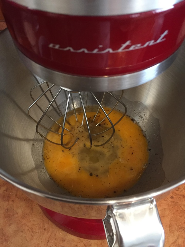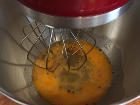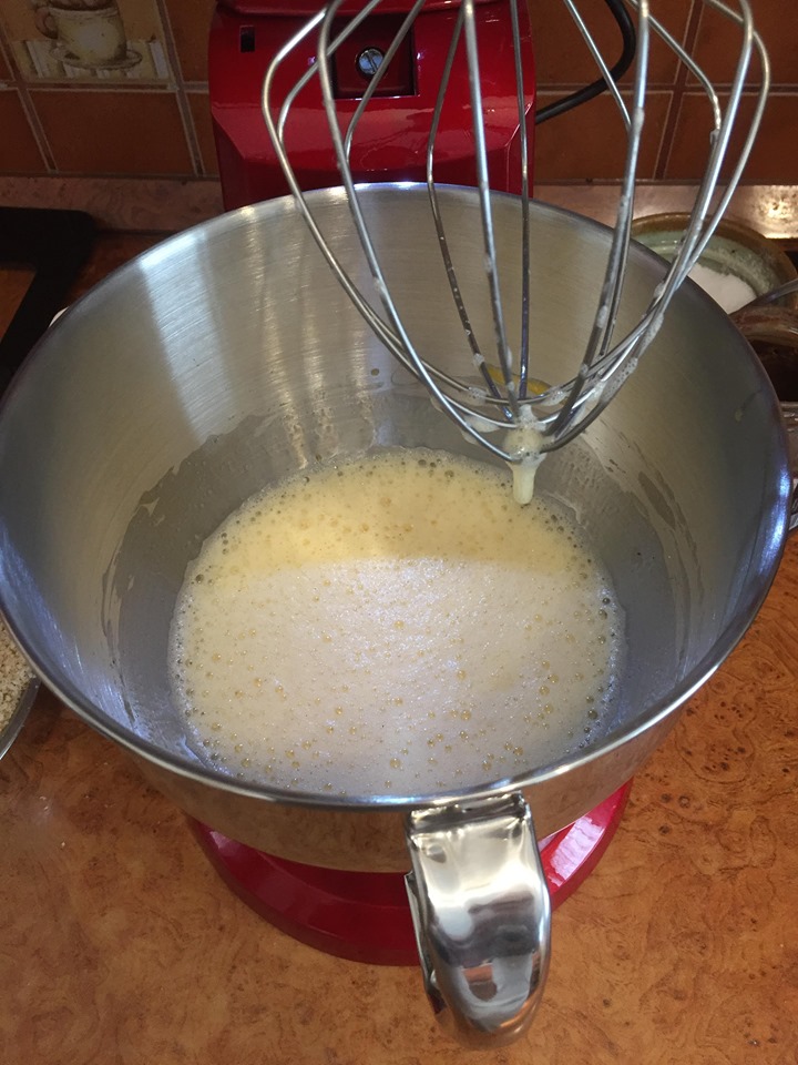 Az egész tojásokat robotgéppel habosra keverjük az édesítővel.