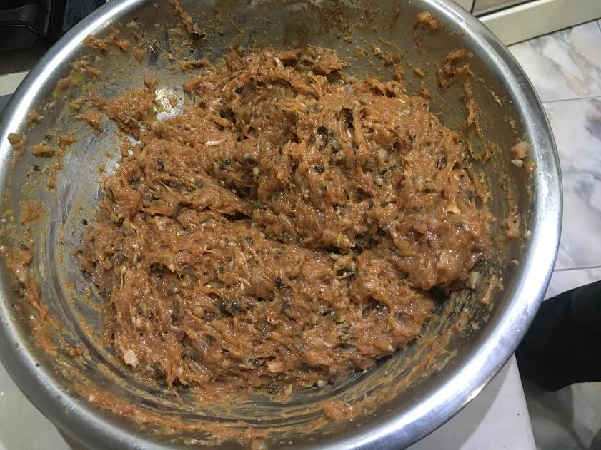 megpucoltuk a gombát, megfőztük, majd a csirkemellel együtt ledaráltuk. Belekevertük a tojást, a fűszereket, jól összedolgoztuk, és hozzáadtuk az útifűmaghéjat. (Zsömle, vagy kenyér helyett, a tojással kiváló "ragasztást" képez).