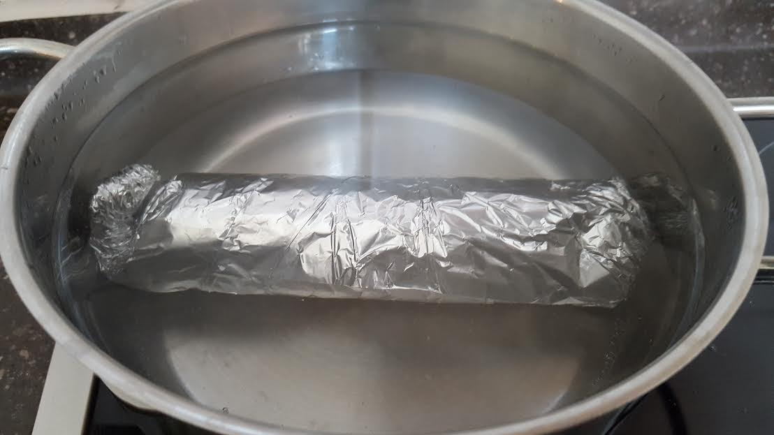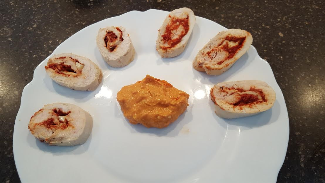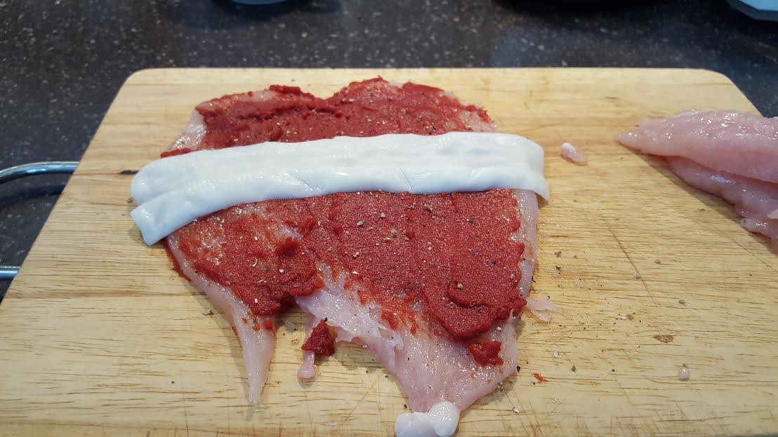A 2 db csirke mell filét ki klopfoljuk és nagyon enyhén sózzuk, megkenjük a paradicsom pürével, ráfektetjük a sajtot és feltekerjük. A tekercseket alufóliába tekerjük és forrásban lévő vízben 5 - 6 percig főzzük és még 5 percig pihentetjük a fóliába. (sokkal tovább nem érdemes főzni, mert a csirke mell kemény lesz). Ezután óvatosan levesszük a fóliát és már szeletelve tálalhatjuk is a friss salátával és a mártással.