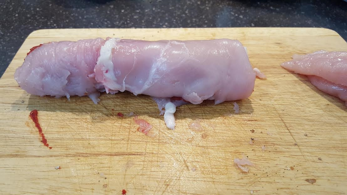 - 1 csirkemell pillangó formájúra széthajtva, ki klopfolva