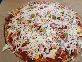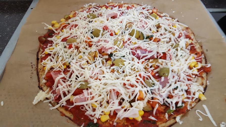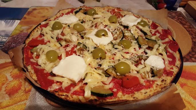 Kiveszem a sütőből az alapot és megkenem az előre elkészített és fűszerezett paradicsompürével és ráhalmozom a cukkinit és a paradicsomot (ezeket előre meggrillezem) rászórom a sajtot, a mozzarellát és végül az olíva bogyókat is ráteszem a tetejére. Visszatolom a sütőbe 15 percre.