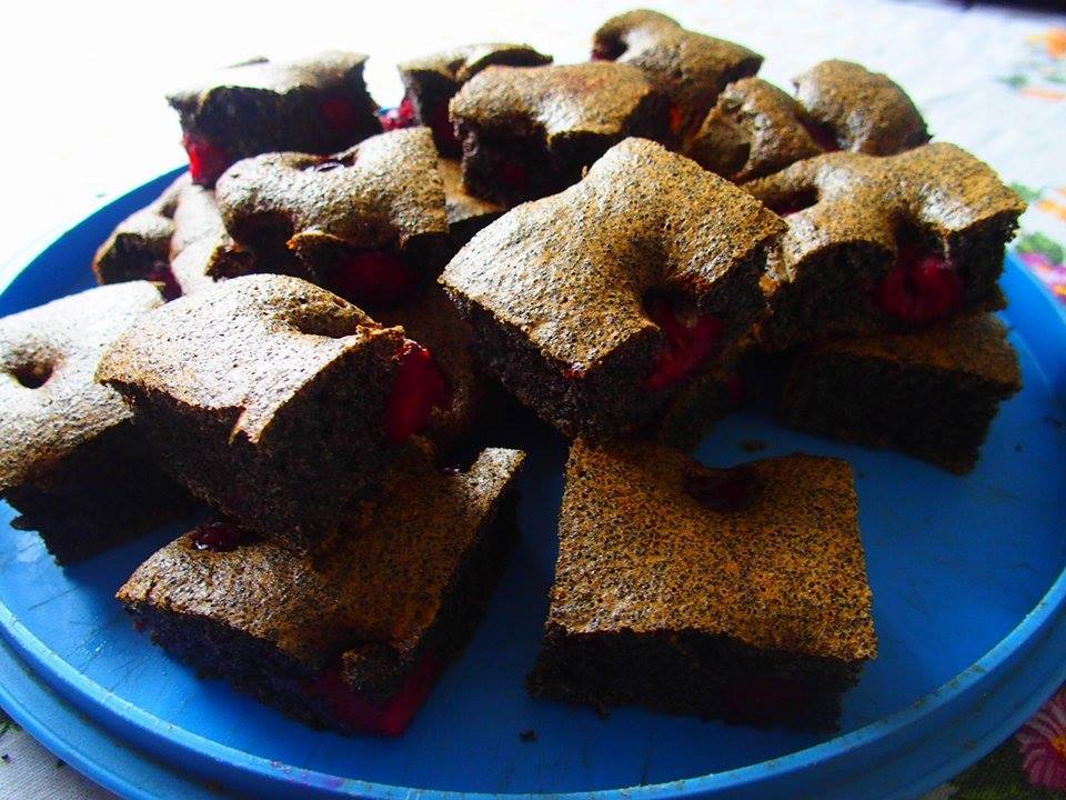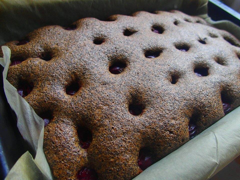 Öntsd az elkészült masszát egy kisebb tepsibe, szórd meg a meggyel és mehet is a sütőbe. 180 fokon kb. 30 perc alatt készre is sül, erről mindenesetre egy villa segítségével győződj meg azért.