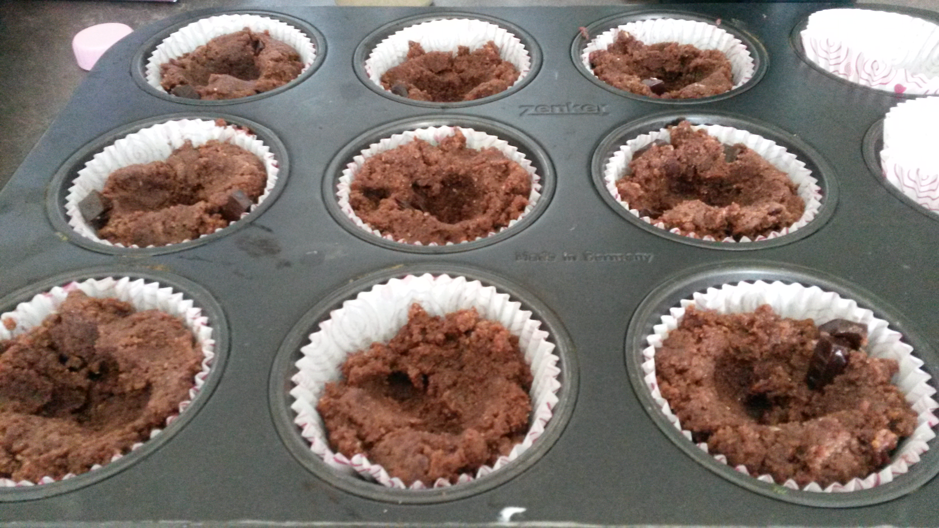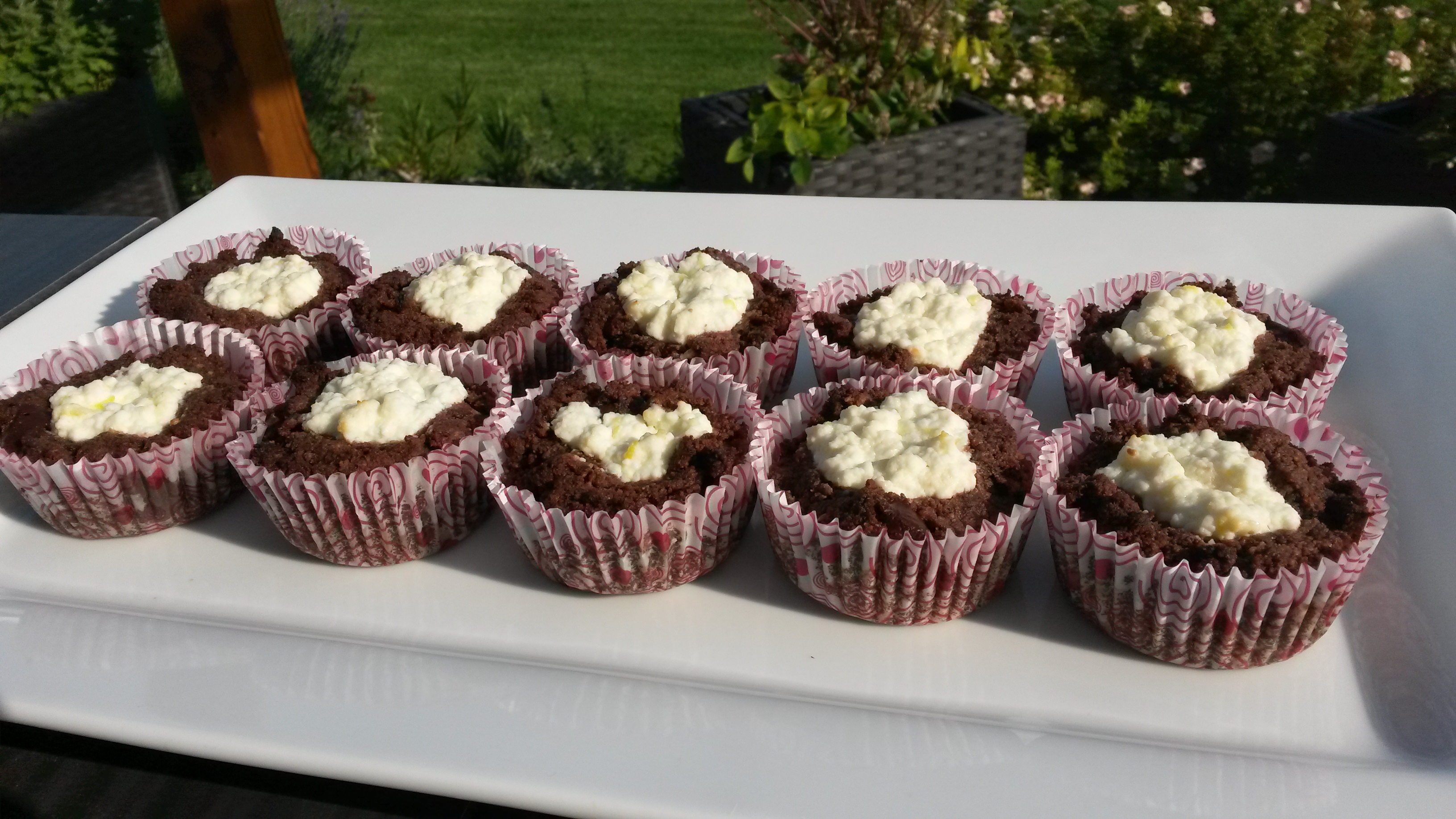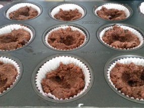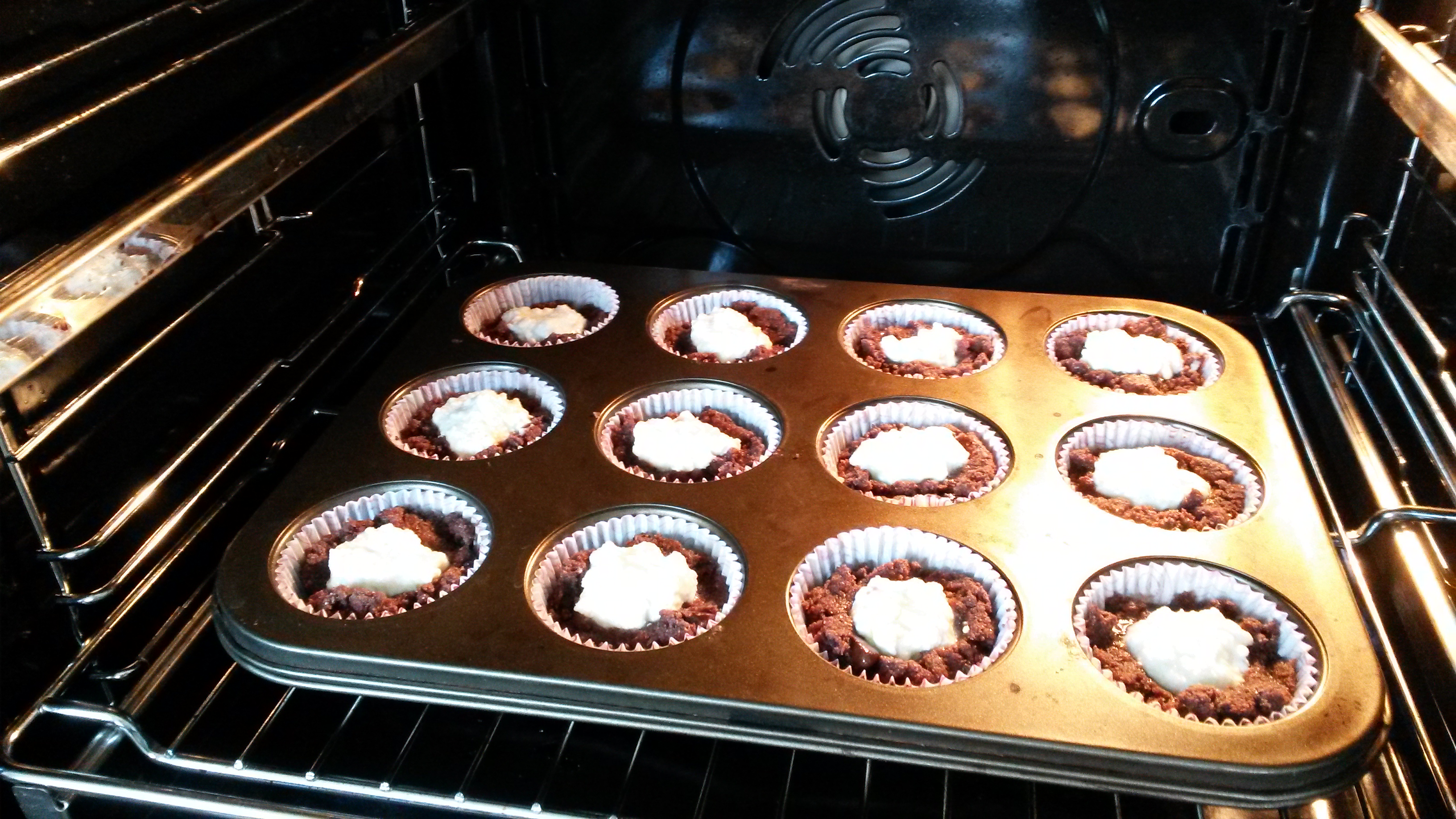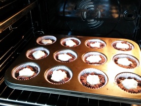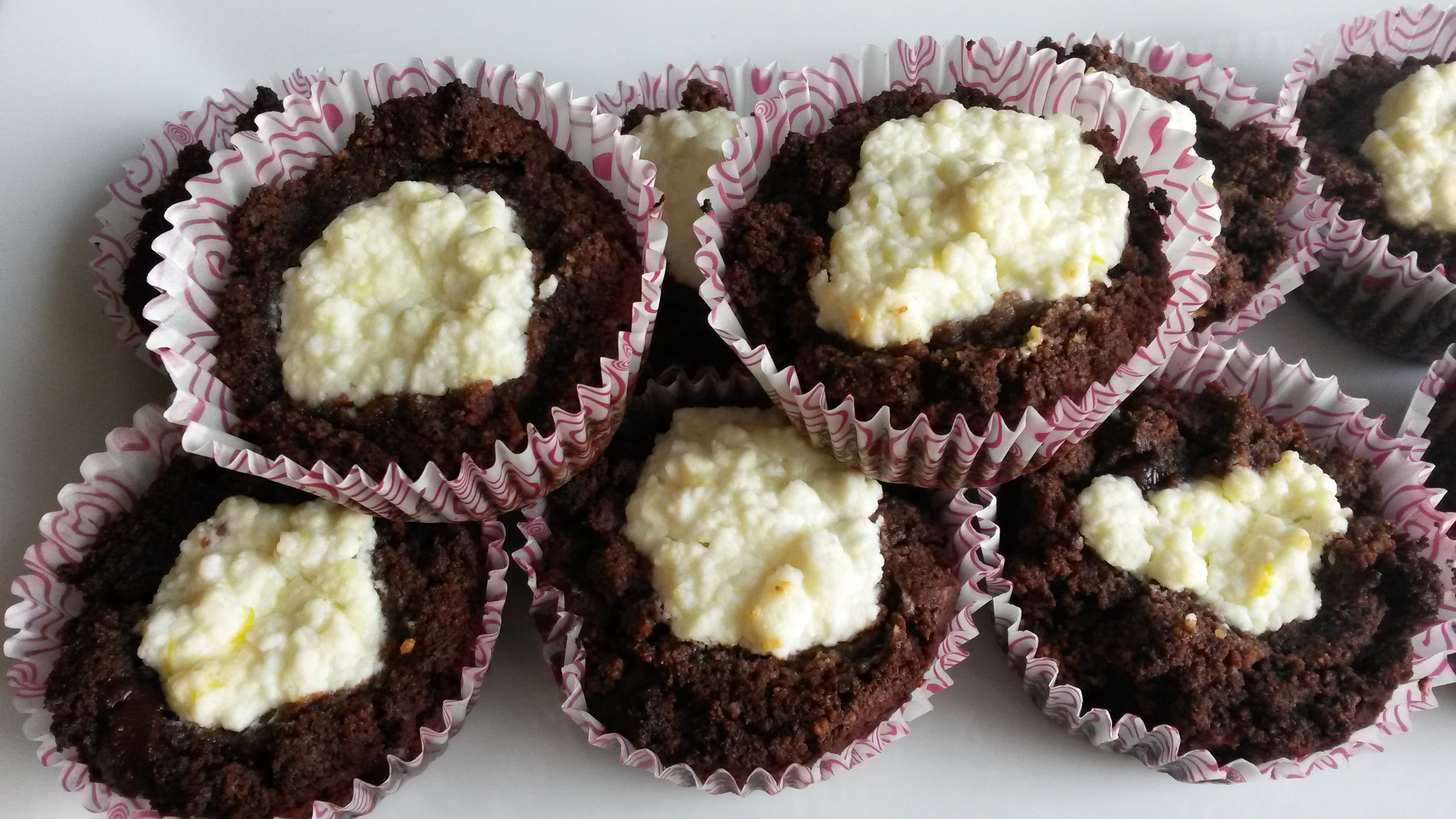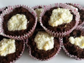 Muffin formába kanalazzuk a csokis masszát, közepébe mélyedést készítünk és belerakunk egy teáskanál túrókrémet.