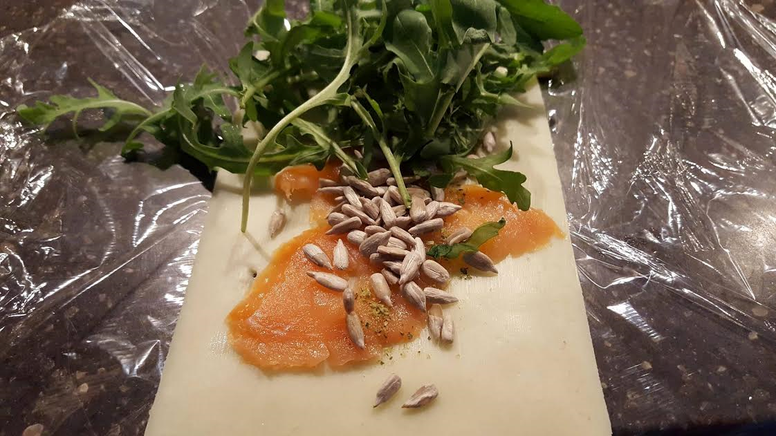 A sajt lapokat leterítjük, megkenjük a kiválasztott krémmel, meg szórjuk a natúr maggal, rá fektetjük a vékony szelet lazacot, az egyik végébe salátát halmozunk és feltekerjük, csomagoljuk és már indulhatunk is.