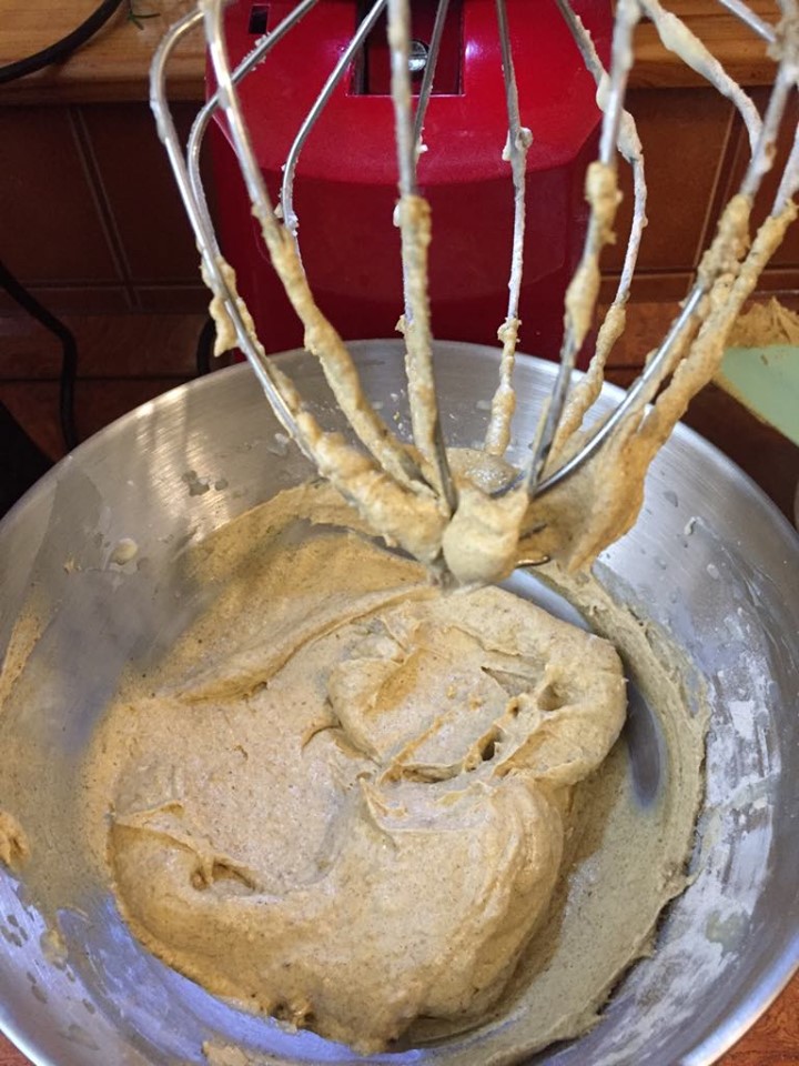 A keverőtálban a vajat habosítjuk a robotgéppel, majd hozzáadjuk a sütőtökpürét, a fahéjat és addig dolgoztatjuk a gépet, míg szép sima masszát nem kapunk.